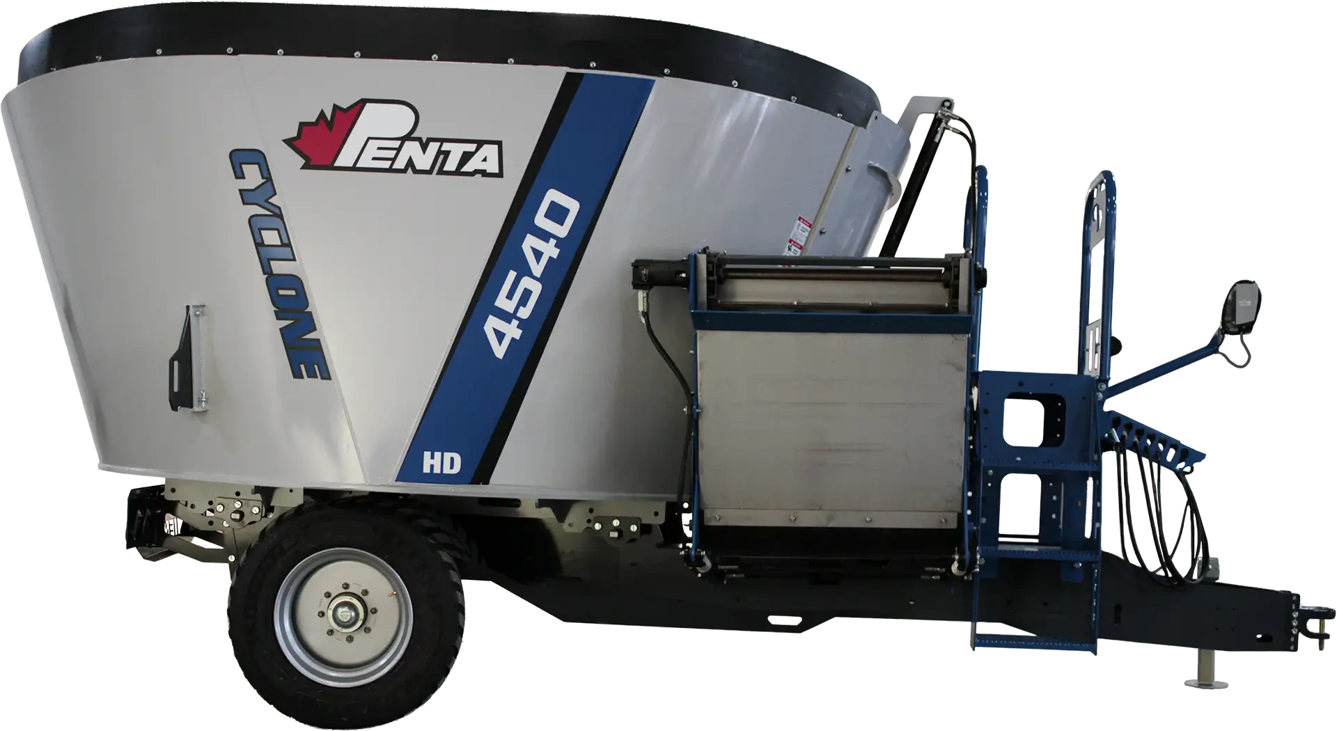 The Penta 4540 is a heavy-duty single-auger trailer mixer built for larger operations. It boasts up to 485 cu ft capacity, rugged construction, and the patented Cyclone Auger, which delivers fast, consistent mixing day in and day out.